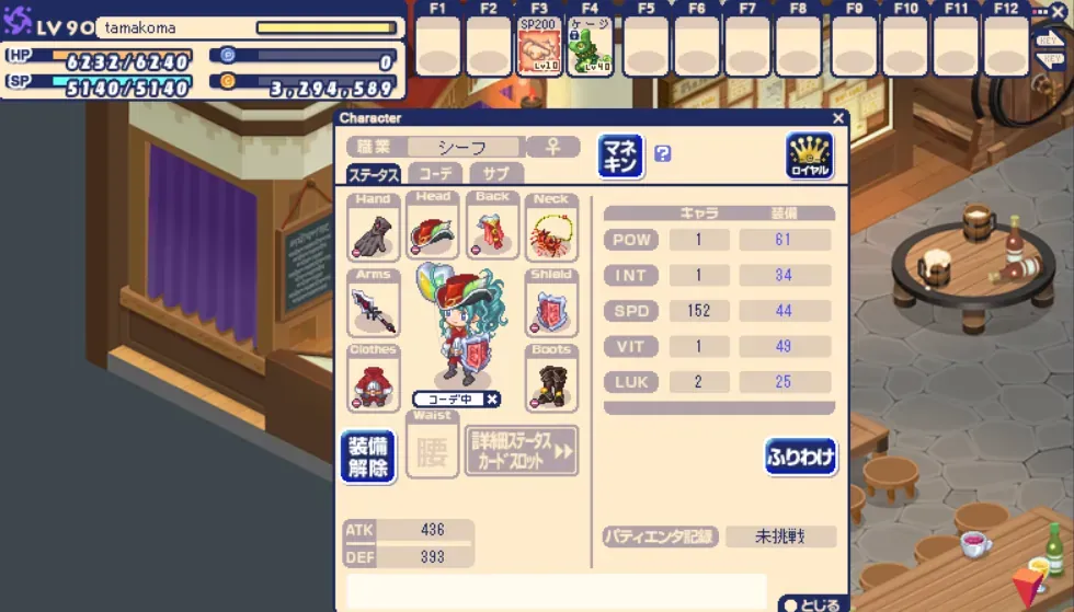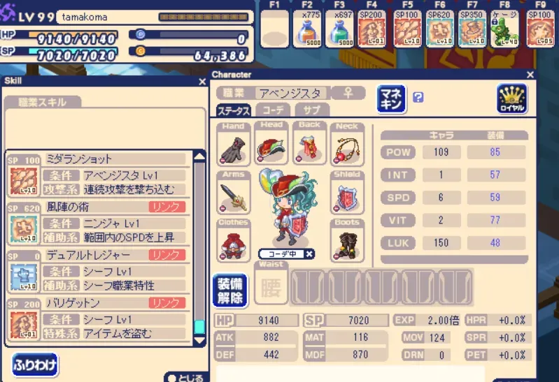 作ってる最中はずっと以下の通りのステータスや装備。