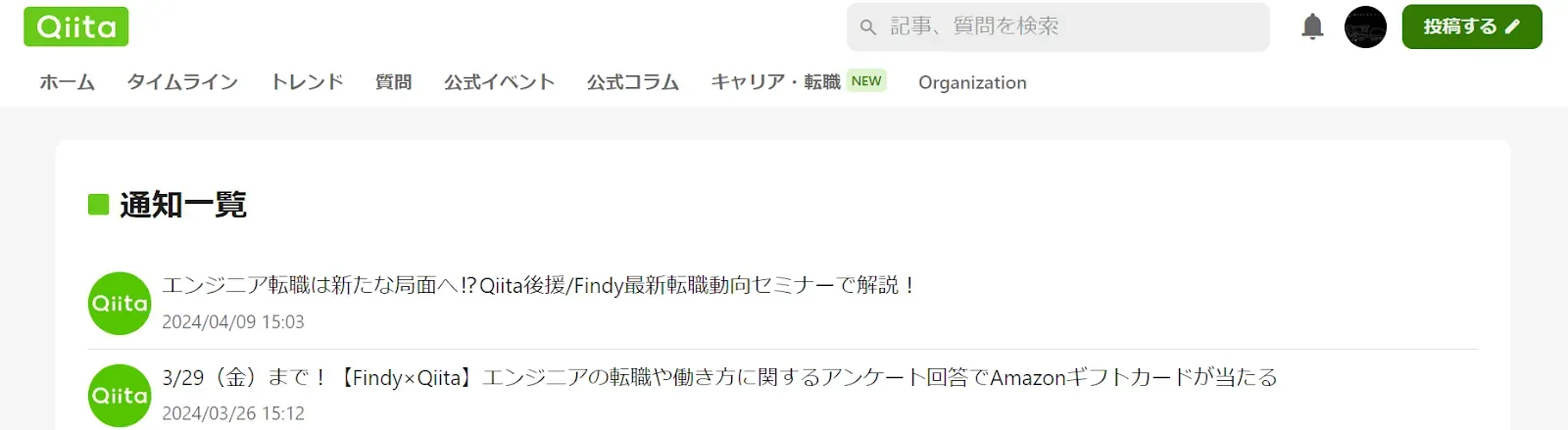 通知を閲覧する画面