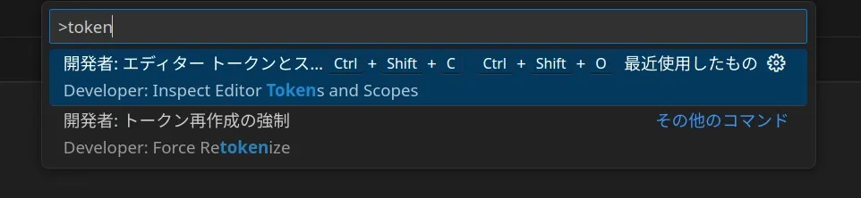 Ctrl+Shift+Pでコマンドパレットを出して、tokenと入力すると「開発者: エディター トークンとスコープの検査」というのが出てくる。
