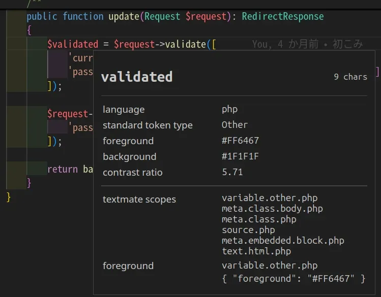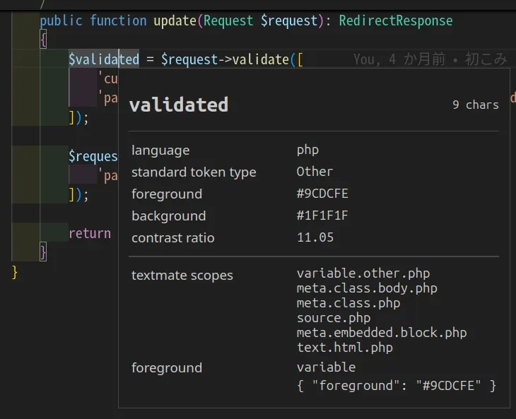 この色変えたい! っていう部分があるファイルを開き、設定したショートカットキーでエディター トークンとスコープの検査を有効にする。