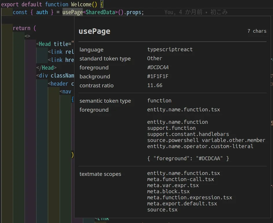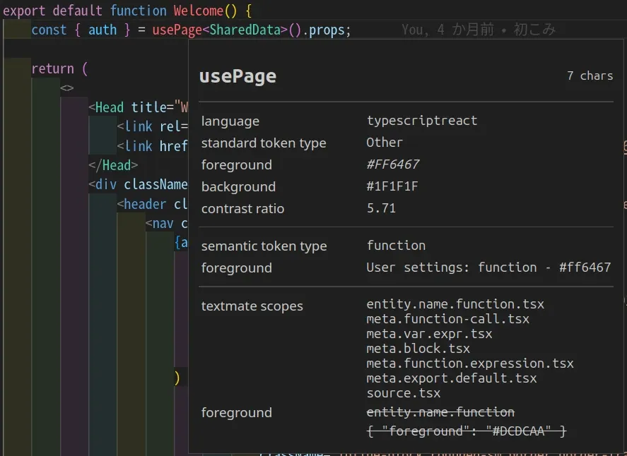 これがセマンティックトークンで、このusePageはfunctionという分析がされたみたい。