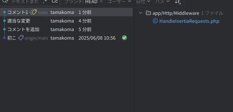 上記gifでは「コメントを追加」というコミットと「コメント追加漏れ」という2つのコミットを1つにスカッシュしている。