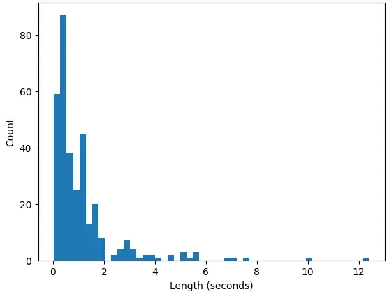 全体の時間の分布を見て決めるために、ヒストグラムで全データの時間を見るコードをChatGPTに出力してもらう。