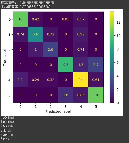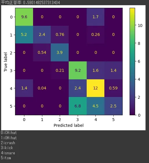 結果を見てみるとタムの正答率が著しく低い。まあ、タムがkick、snareと似てるのはわかる。