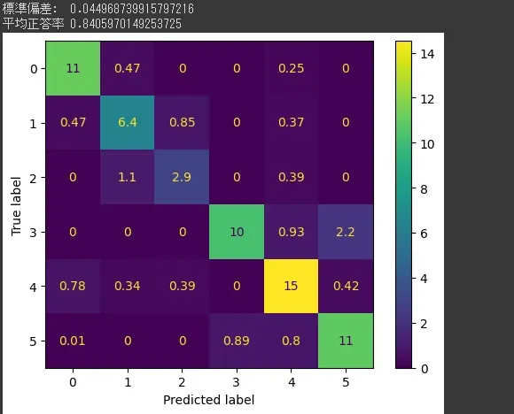 以下のコードはwavファイルをMFCCにして、データの訓練とテストを100回やって平均正答率、標準偏差を出し、混同行列を表示するところまでやってるよ。