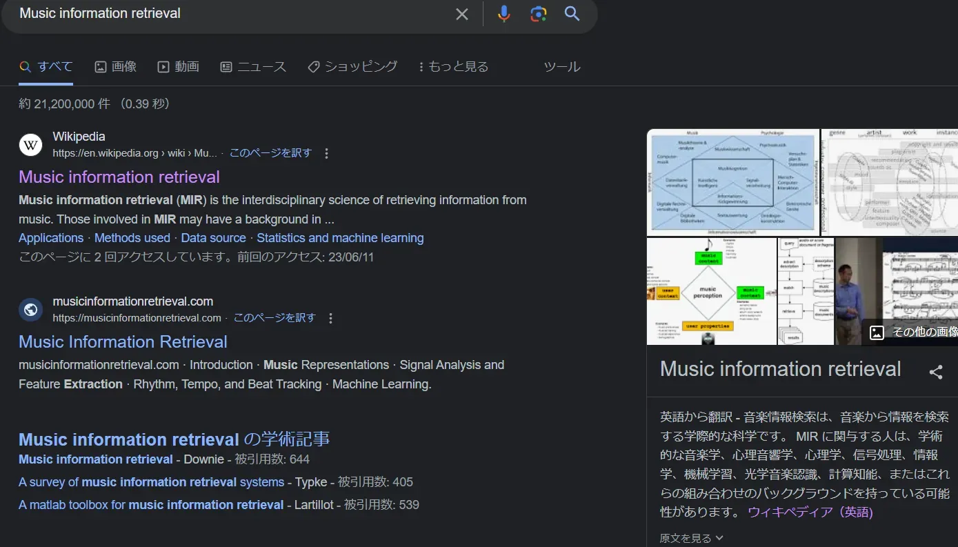 実際にGoogleで「Music information retrieval」と調べても英語記事しか出ない。まあ、そりゃあ英語で調べてるから当然ではある。因みに、MIRという言葉はChatGPT-4から仕入れた。