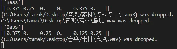 因みに、今回のBassは内部的に[0.3685 0.085 0.14 0. 0.09583333 0.31066667]と予測されていて、順に[Bass,FX,Lead,Pad,Pluck,Stab]なので、結構ギリギリベースって判断した感じ。