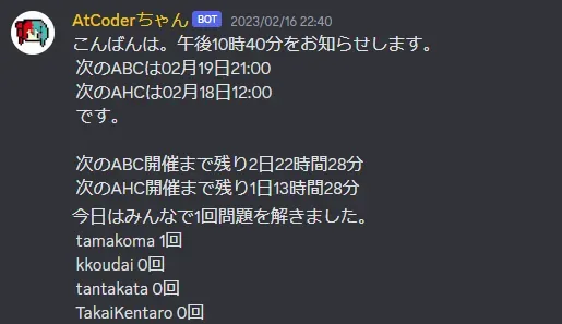 ゼロから作るDeepLearningもアルゴリズム本も読了してちょっとだけ余裕が出来たので、DiscordでAtcoderの様々な情報を通知してくれるbotを作ってみた。